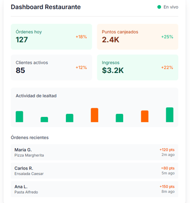 Monitorea métricas clave, órdenes activas y tendencias de clientes desde una interfaz intuitiva.